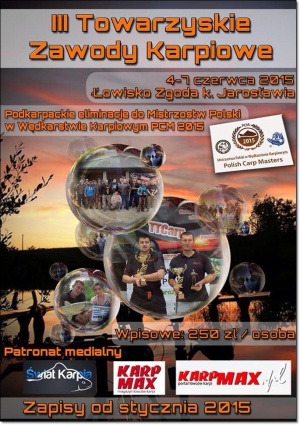 Informacja od organizatorów: „III Towarzyskie Zawody Karpiowe” tradycyjnie już zagwarantują Wam rywalizacje na wysokim poziomie oraz fantastyczna atmosferę. My ze swojej strony staramy się rozwijać naszą imprezę dlatego w 2015r. ,zawody są także Eliminacjami do Mistrzostw Polski PCM 2015 (zwycięska ekipa ma zapewniony i opłacony start), dodatkowo zawodnicy mają zapewnione ciepłe dwudaniowe posiłki (3x). Zawody po raz kolejny odbędą się na łowisku Zgoda k. Jarosławia, więc możecie liczyć na dużą ilość złowionych ryb i sporą dawkę emocji do ostatnich minut rywalizacji."
